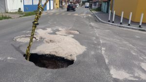 Um perigoso buraco se abriu na Rua Borges de Barros, no Bairro Imbassay (esquina com a Travessa São Maurício, que...
